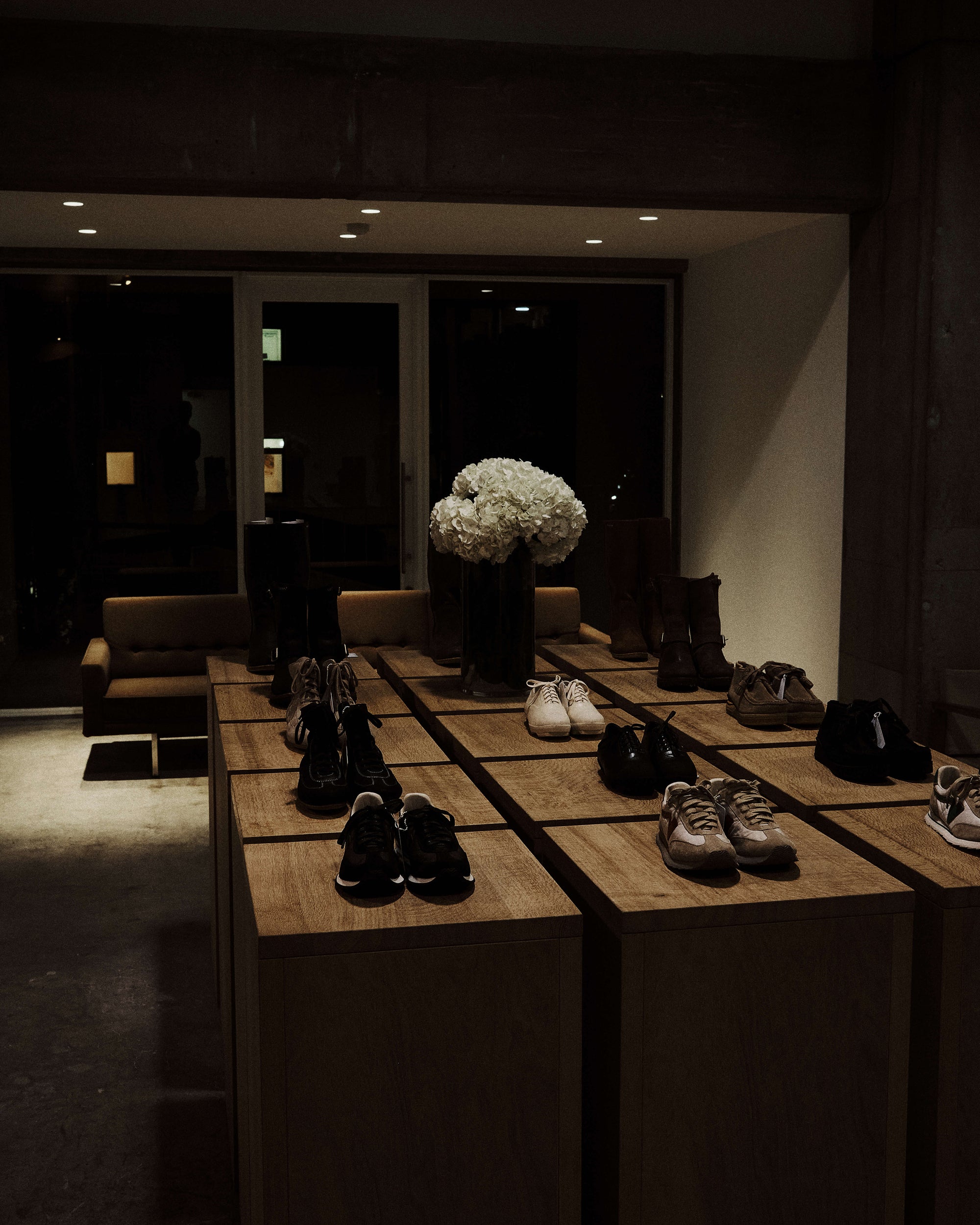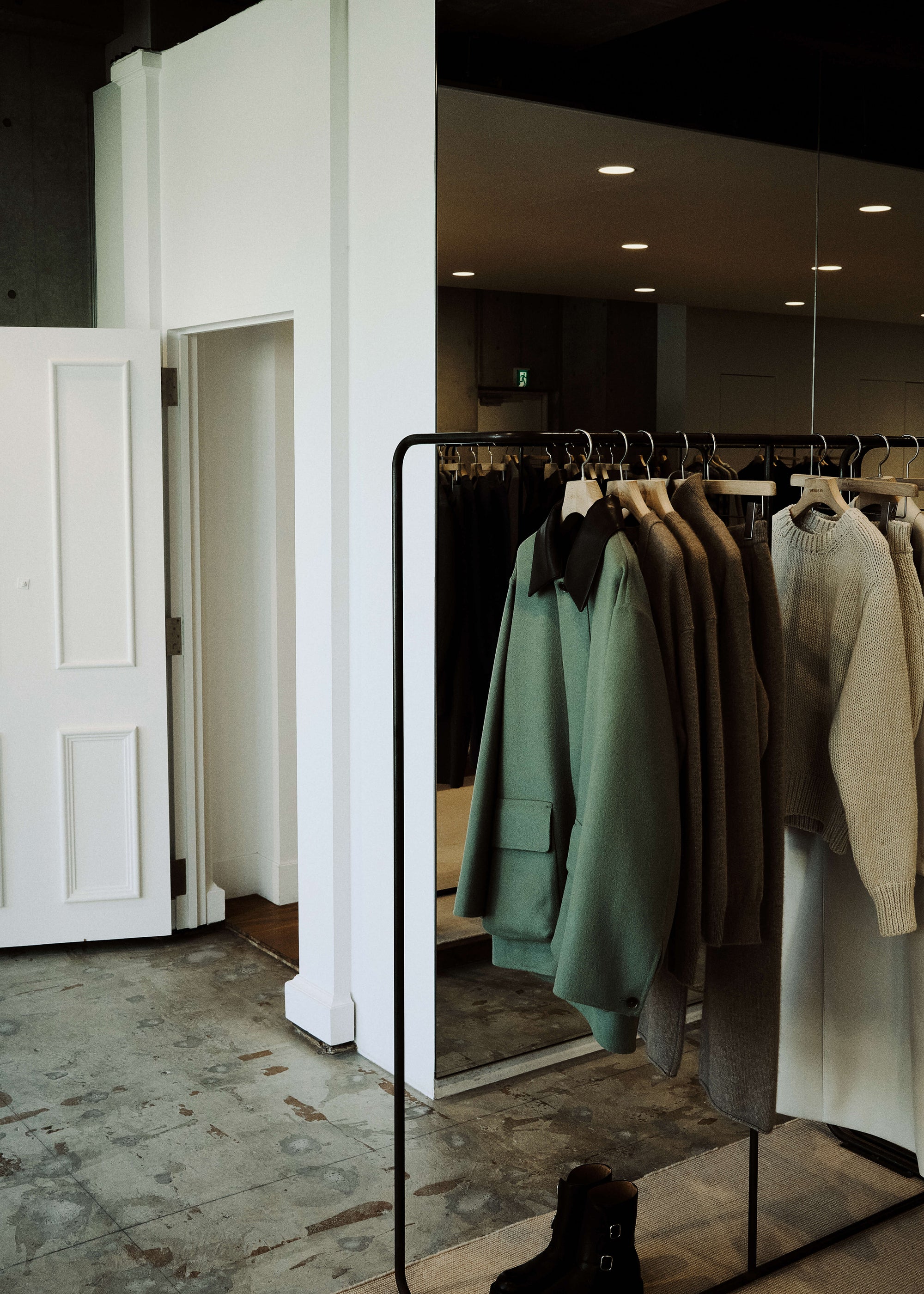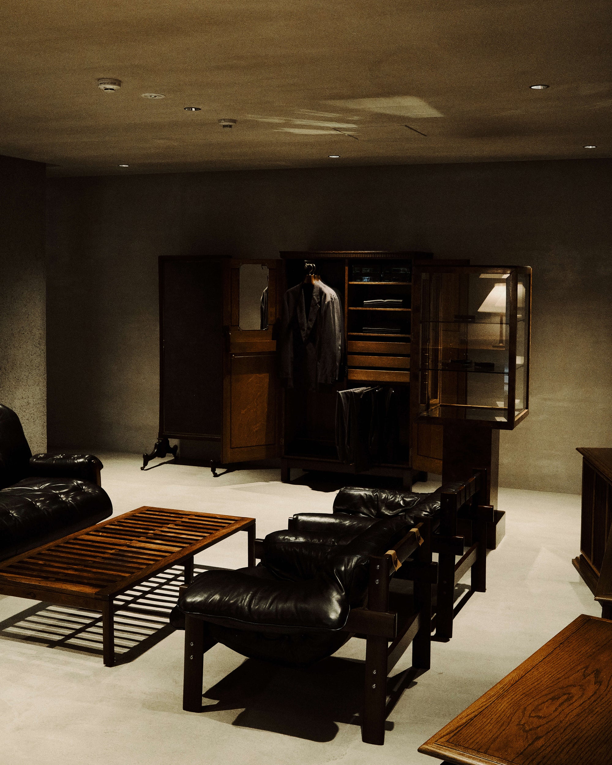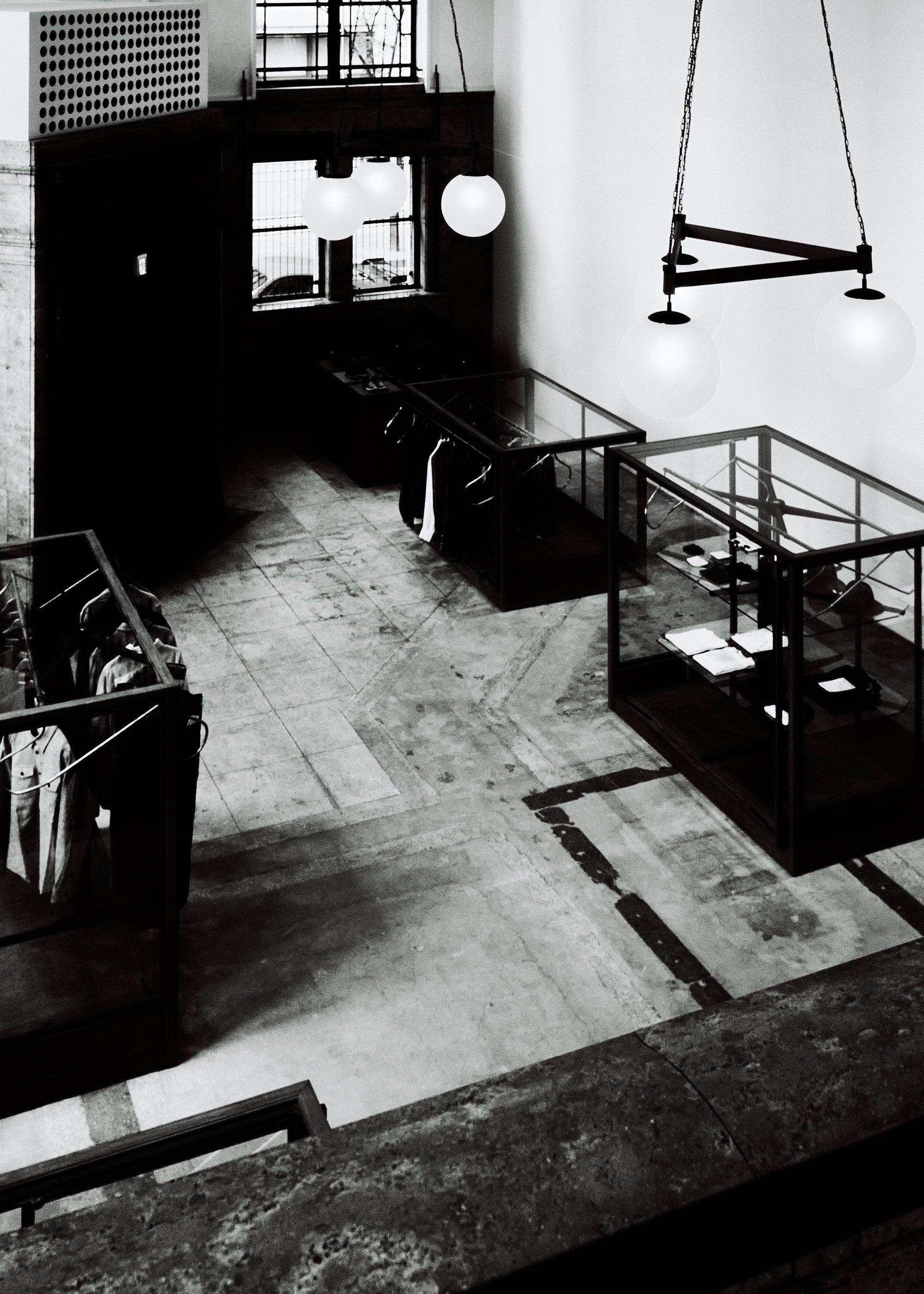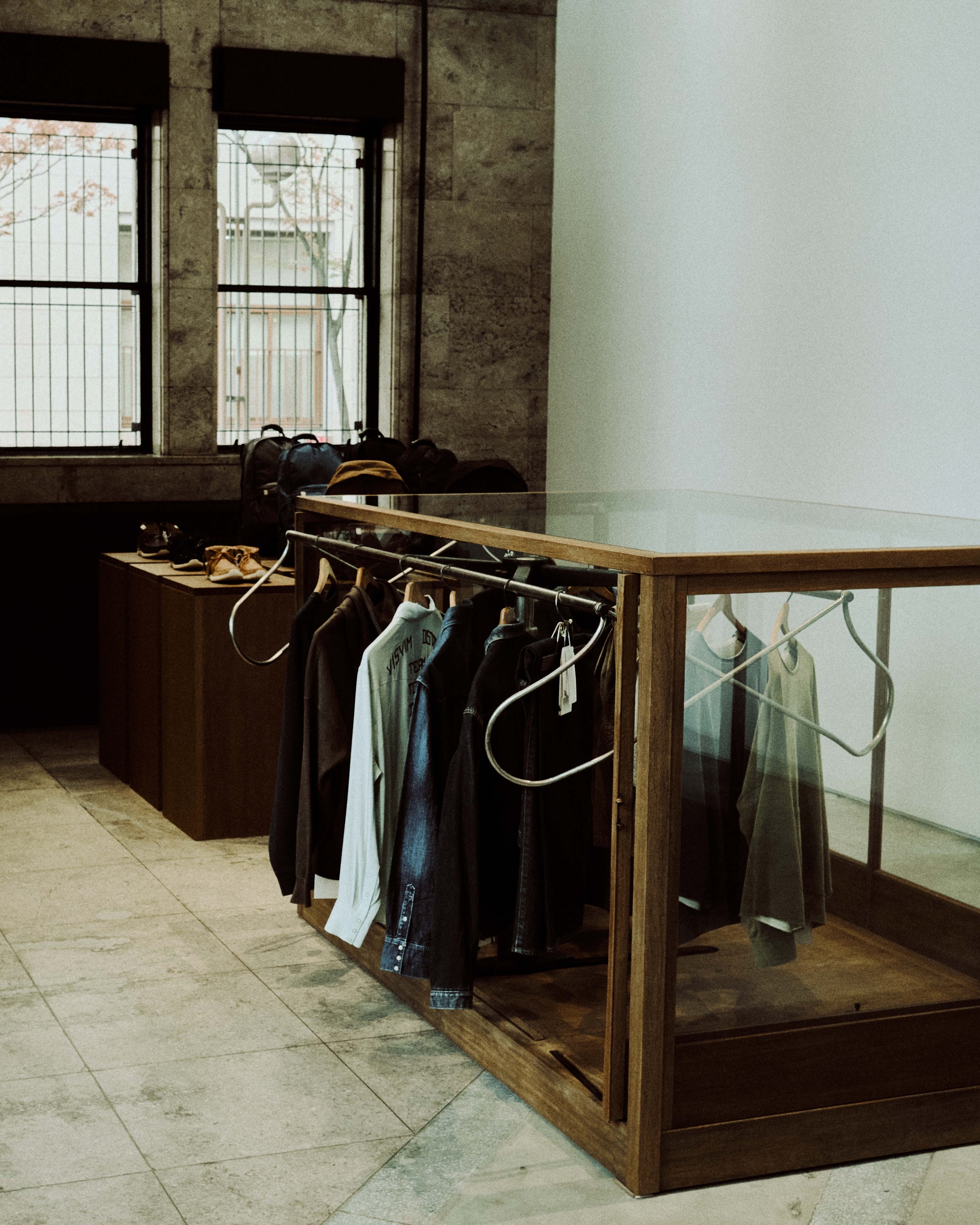 The WMV VISVIM KOBE store is housed in the former Kobe branch of Chartered Bank, located inside the historic 1938 Chartered Building. Its original rotating wooden door and stately façade preserve the character of the old foreign-settlement district. Inside, the soaring two-story atrium, vertical windows, and untouched stone and concrete surfaces reveal the building’s past with an honest, architectural gravity. visvim’s interventions — from hand-crafted wooden fixtures to 1930s-inspired lighting and traditional “naguri” timber details — are added with precision and restraint. The result is a space where heritage and contemporary craftsmanship coexist in quiet harmony.
