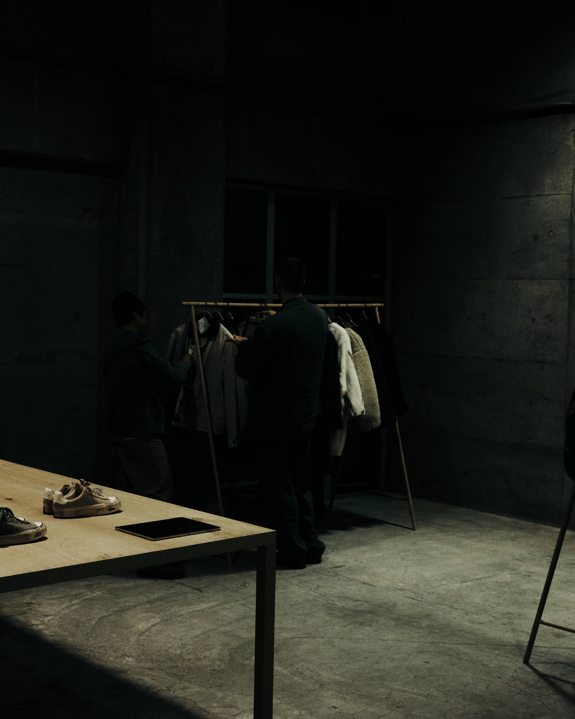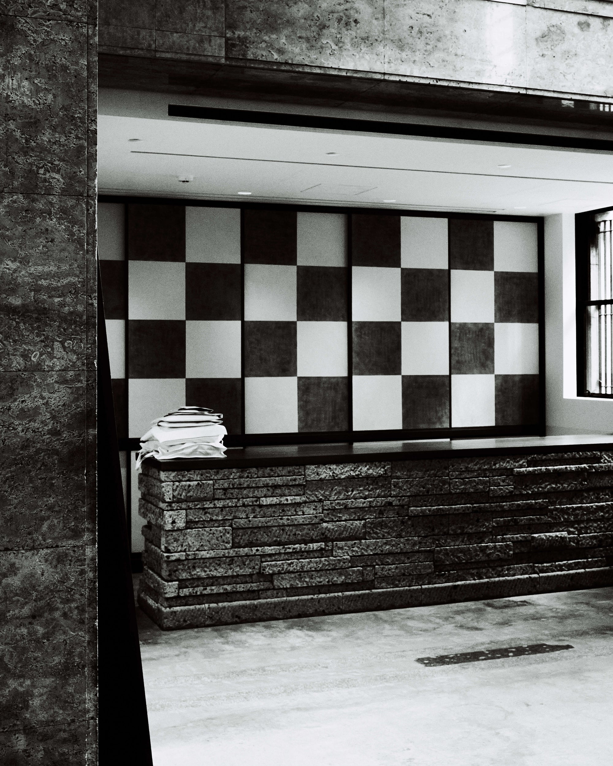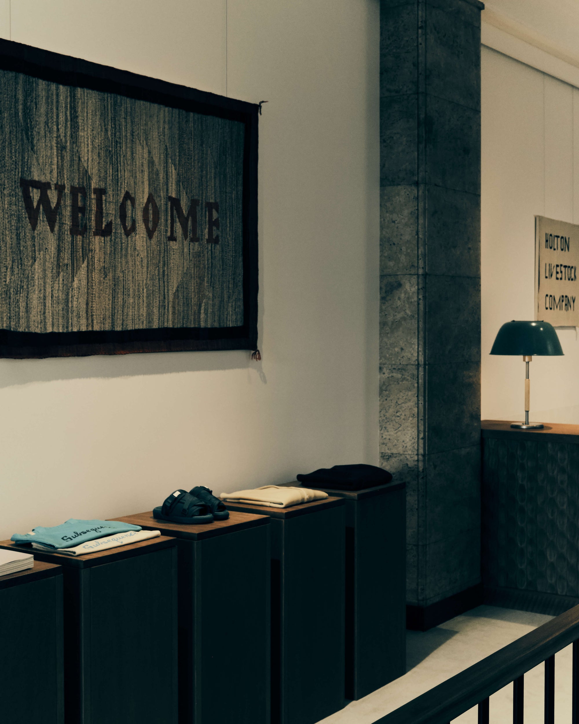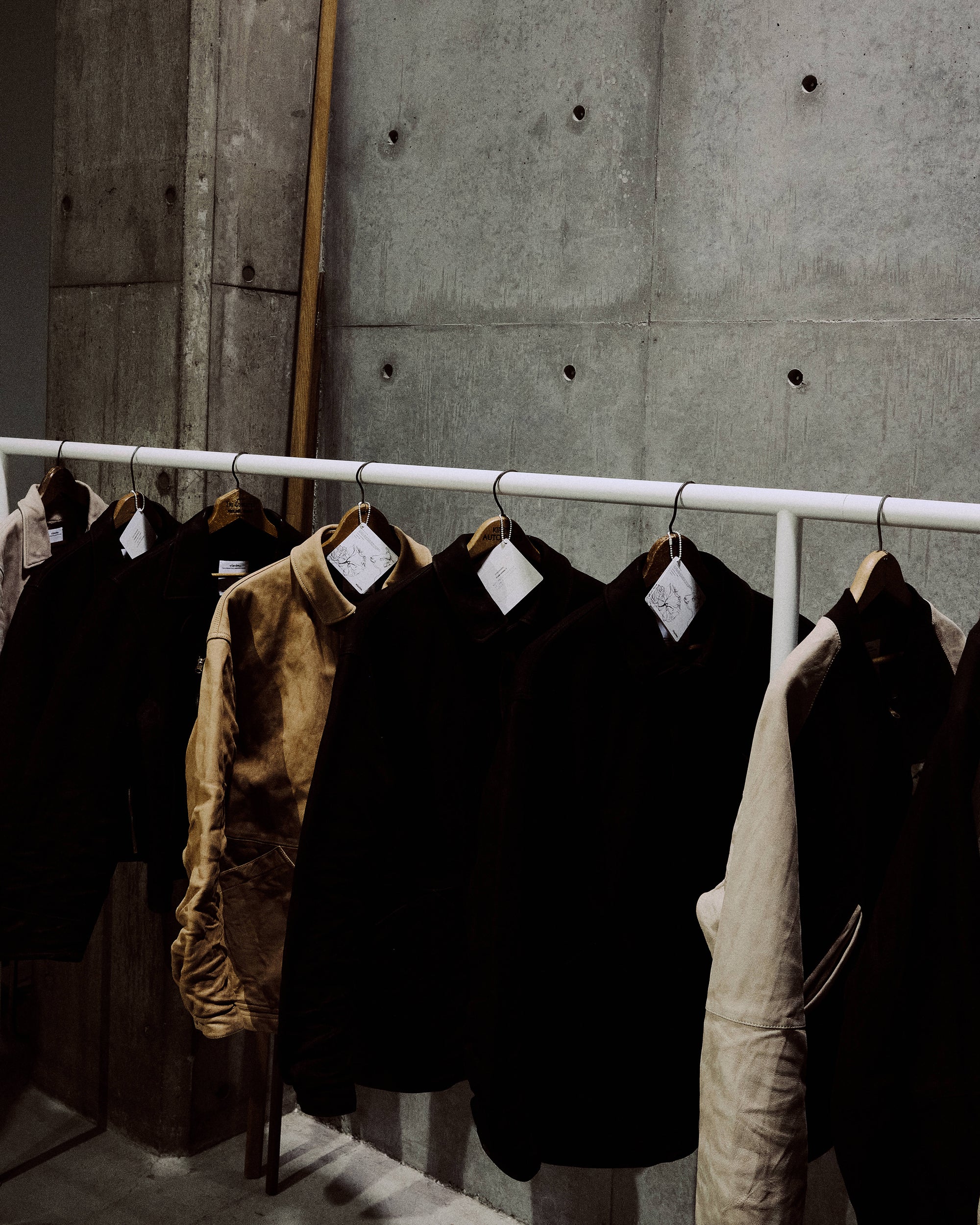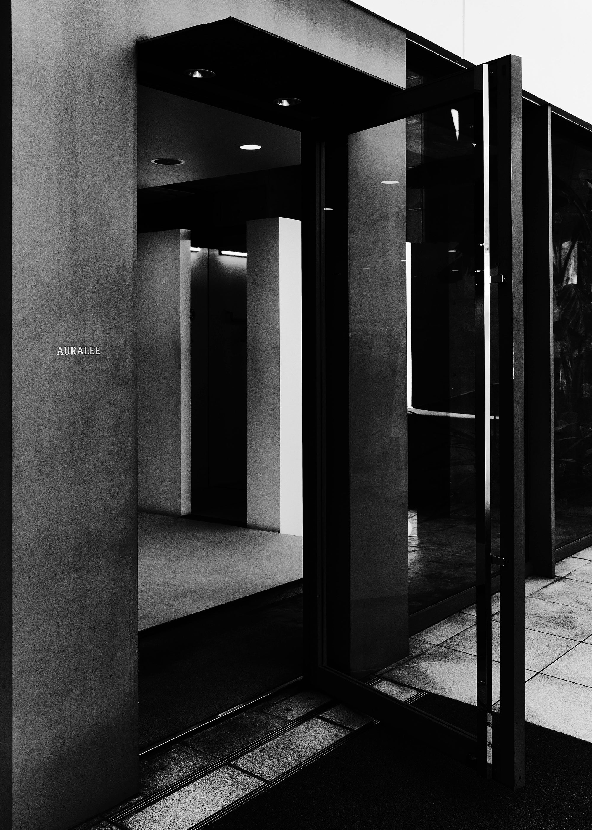 The WMV VISVIM KOBE store is housed in the former Kobe branch of Chartered Bank, located inside the historic 1938 Chartered Building. Its original rotating wooden door and stately façade preserve the character of the old foreign-settlement district. Inside, the soaring two-story atrium, vertical windows, and untouched stone and concrete surfaces reveal the building’s past with an honest, architectural gravity. visvim’s interventions — from hand-crafted wooden fixtures to 1930s-inspired lighting and traditional “naguri” timber details — are added with precision and restraint. The result is a space where heritage and contemporary craftsmanship coexist in quiet harmony.