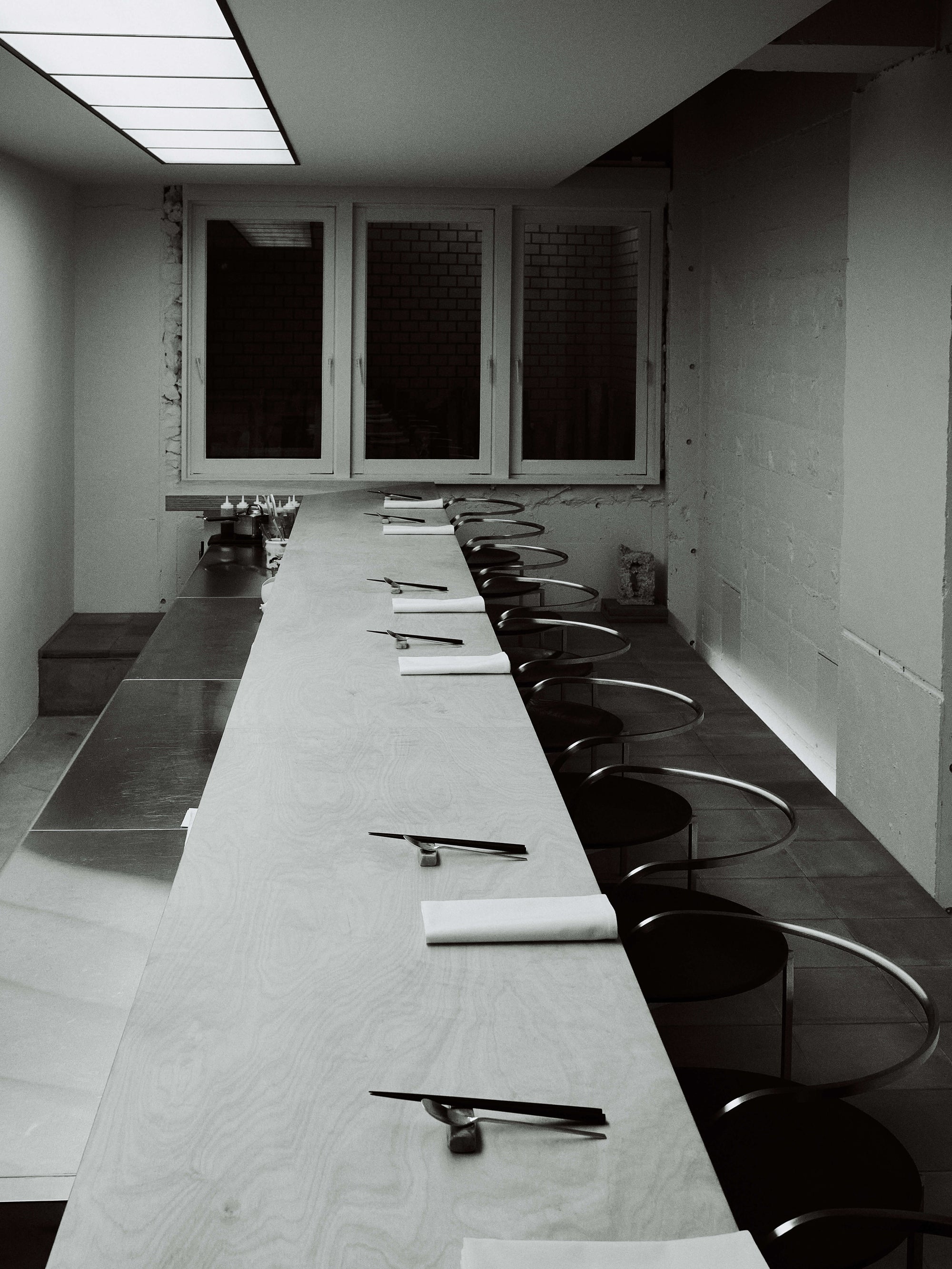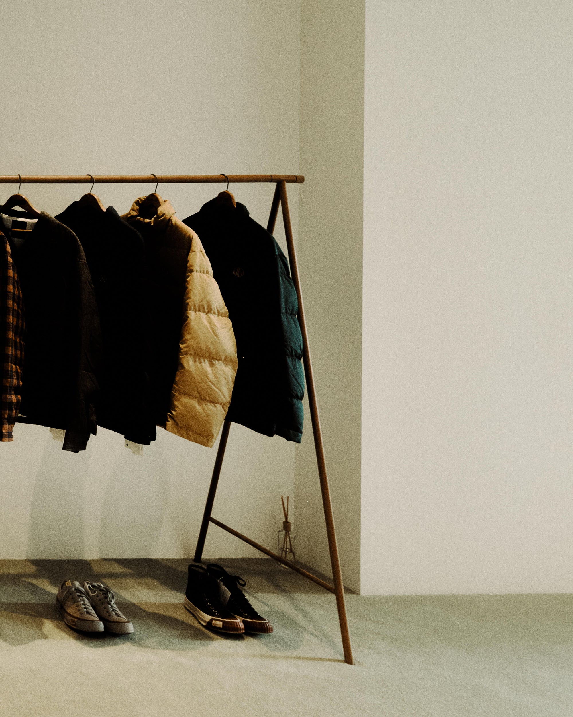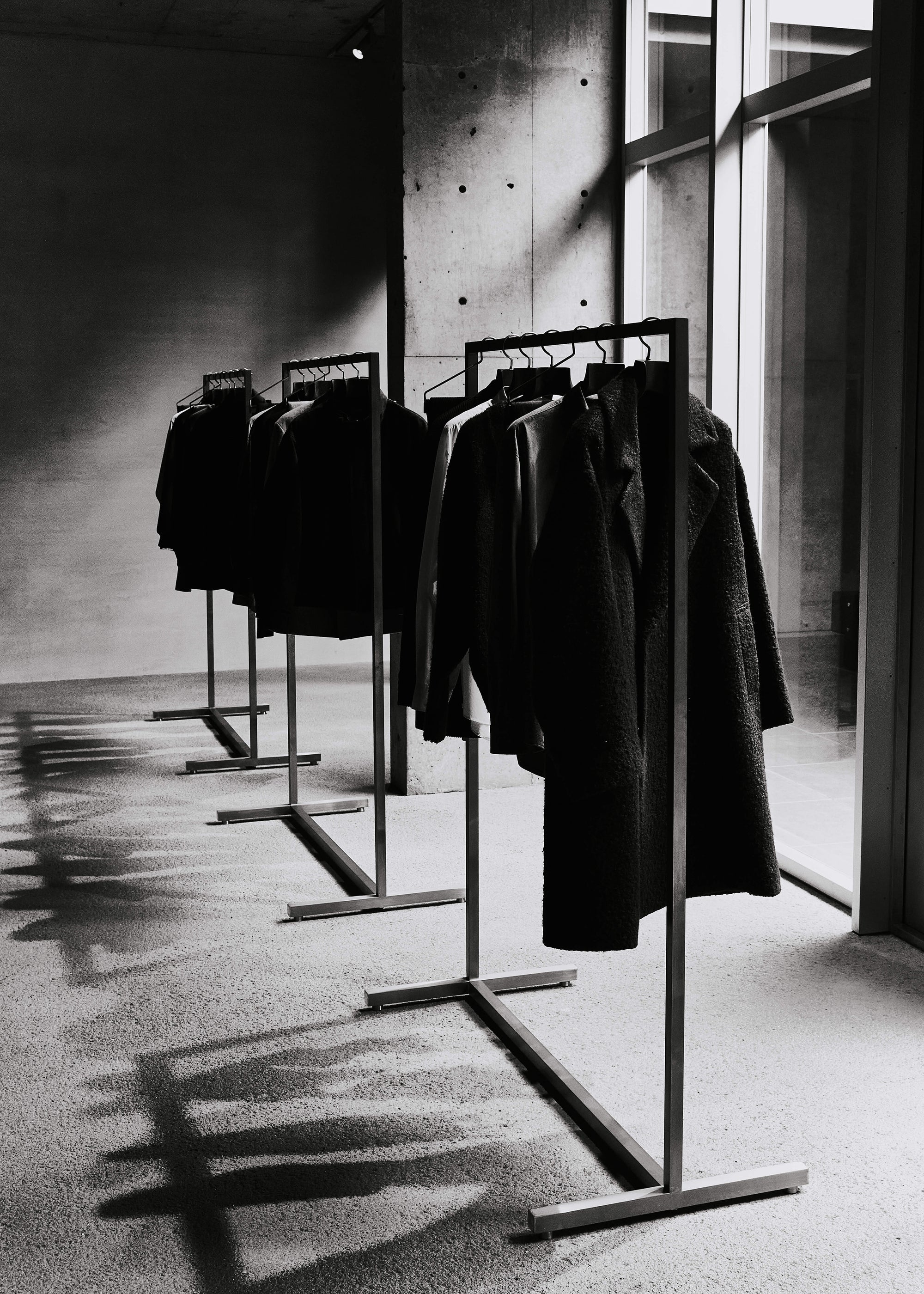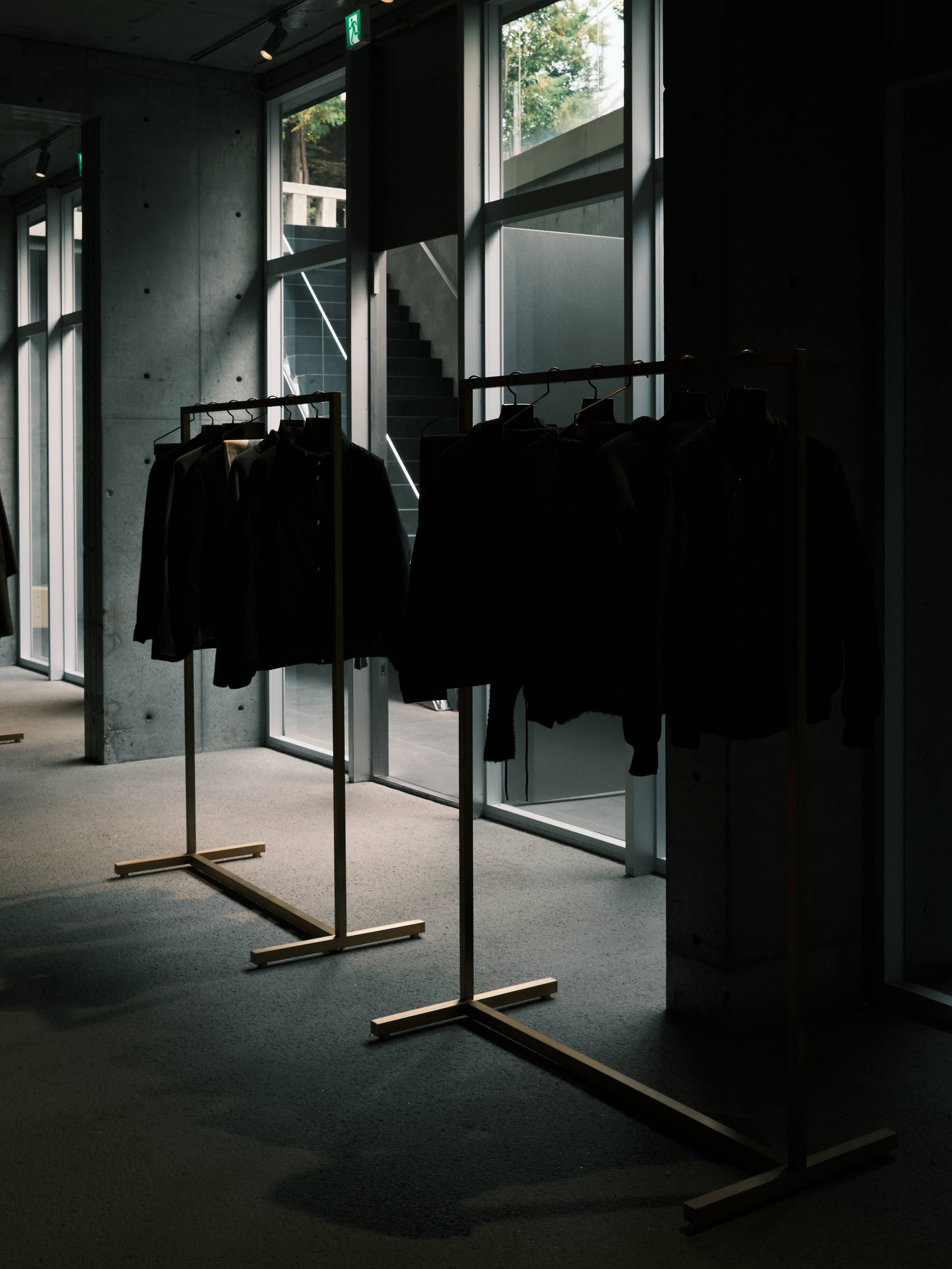 The WMV VISVIM KOBE store is housed in the former Kobe branch of Chartered Bank, located inside the historic 1938 Chartered Building. Its original rotating wooden door and stately façade preserve the character of the old foreign-settlement district. Inside, the soaring two-story atrium, vertical windows, and untouched stone and concrete surfaces reveal the building’s past with an honest, architectural gravity. visvim’s interventions — from hand-crafted wooden fixtures to 1930s-inspired lighting and traditional “naguri” timber details — are added with precision and restraint. The result is a space where heritage and contemporary craftsmanship coexist in quiet harmony.